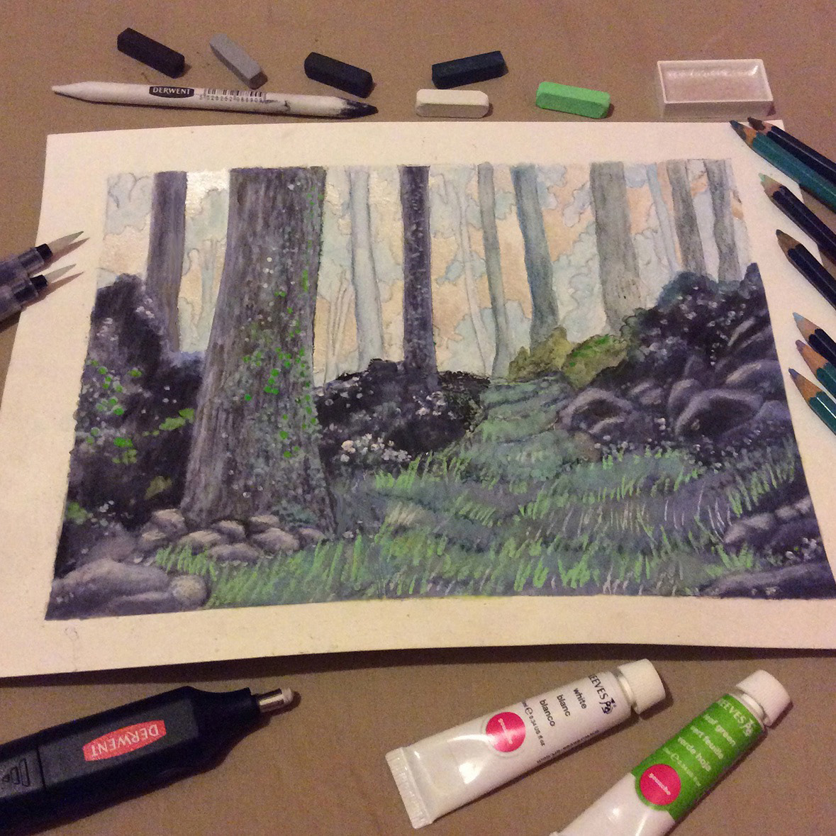 I've been searching for online tutorials and finally experienced watercolor pencils. Mixed media with Derwent watercolor pencils + soft pastels + gouache and Kuretake metallic watercolor on Canson paper.