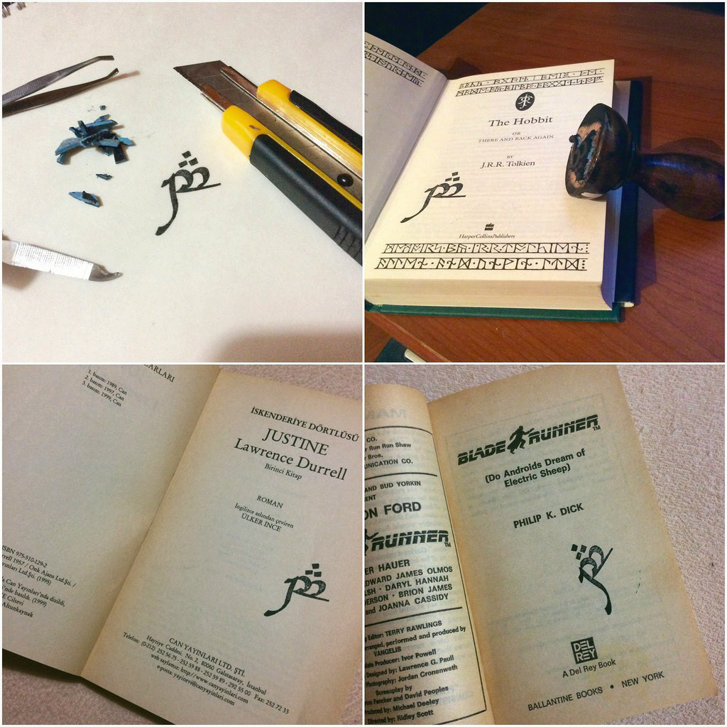I crafted a rubber book stamp consisting of my initials in Elvish.