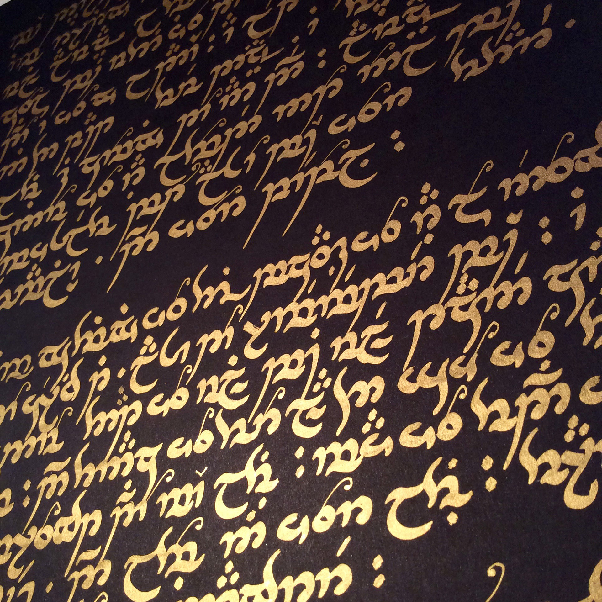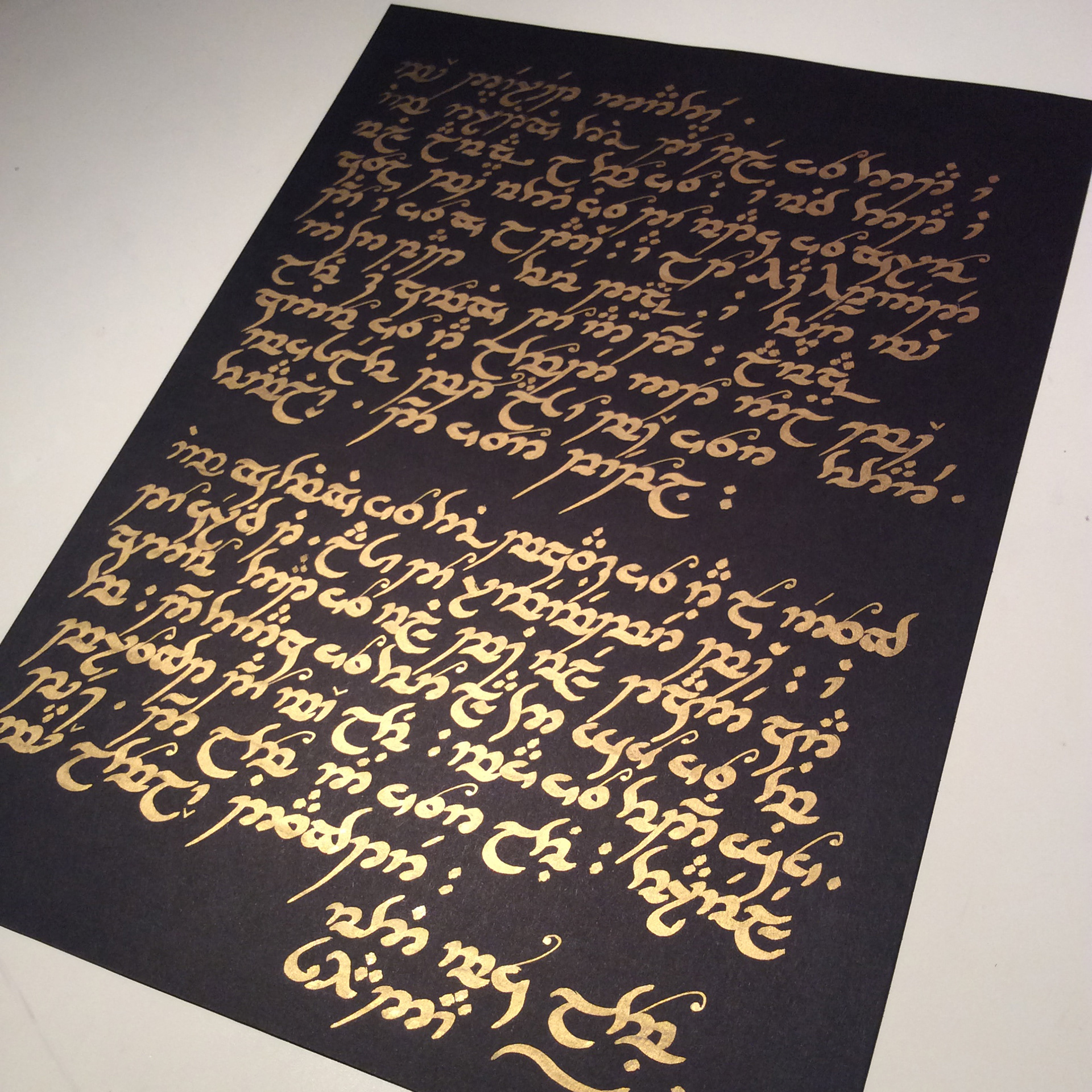 Elvish (Sindarin) handwriting, gold ink on black paper. (Sindarin by J.R.R. Tolkien)