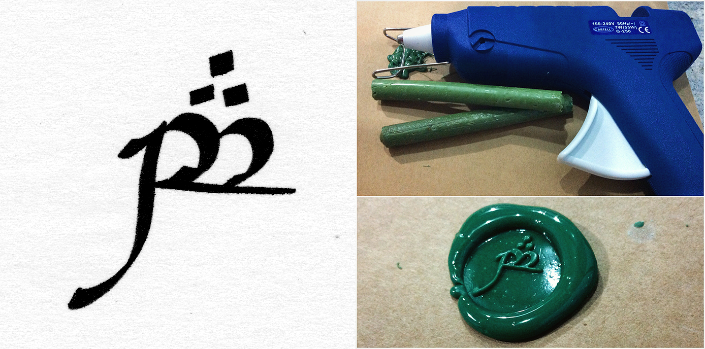 Elvish Signature Seal. Applied my handwritten tengwar initials ‘AB’ on a 2cm brass seal. With forest green seal wax and a silicone gun to melt it.