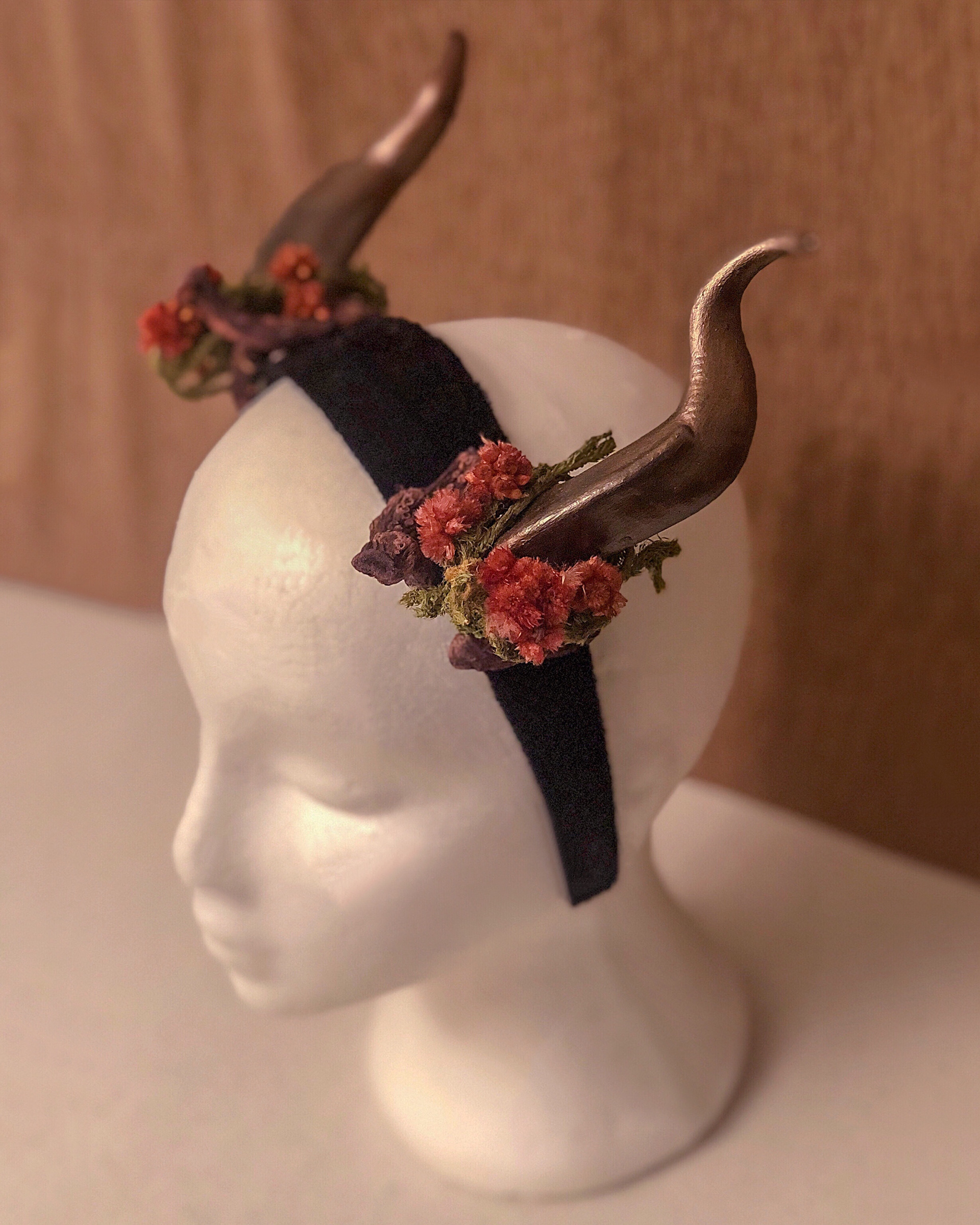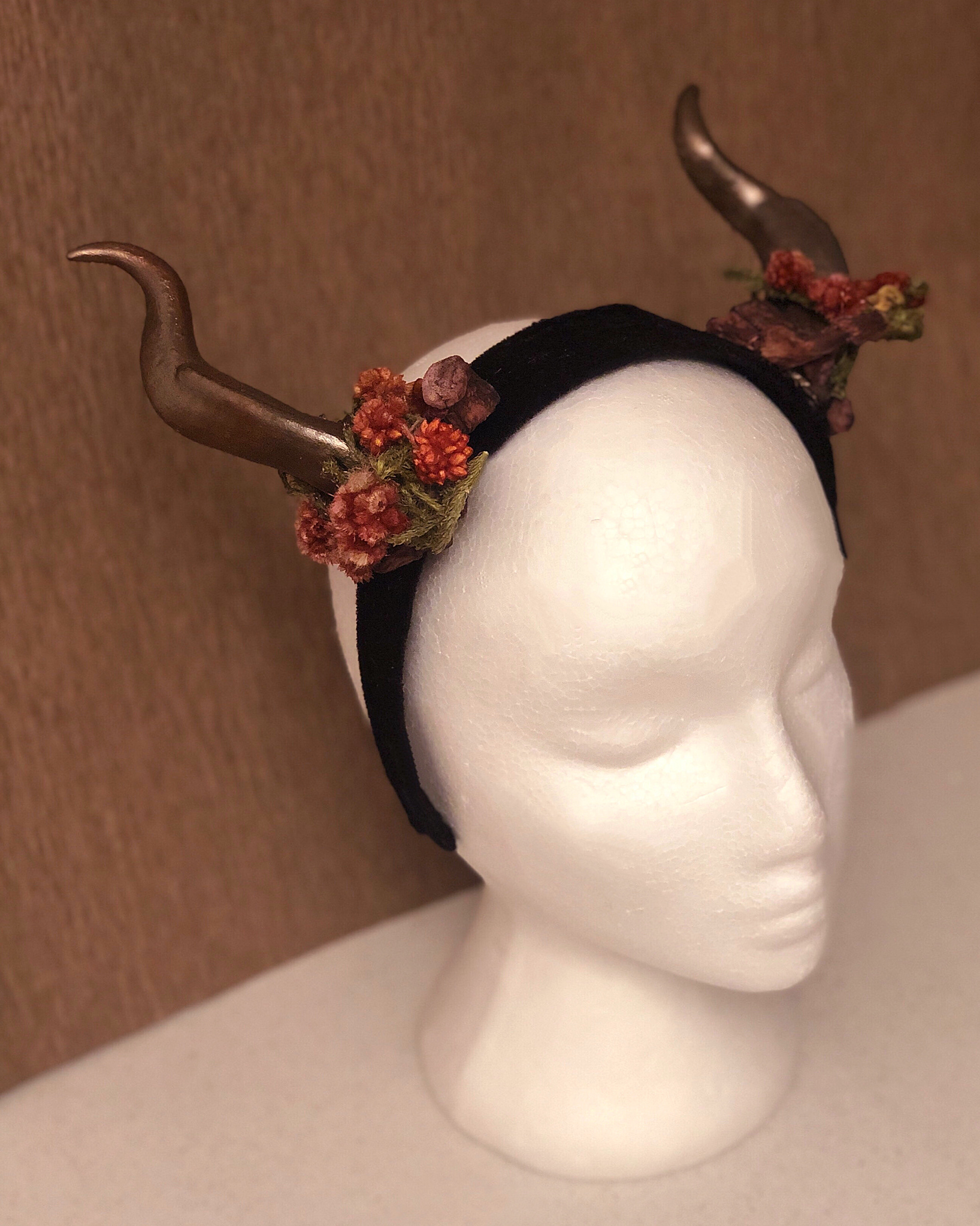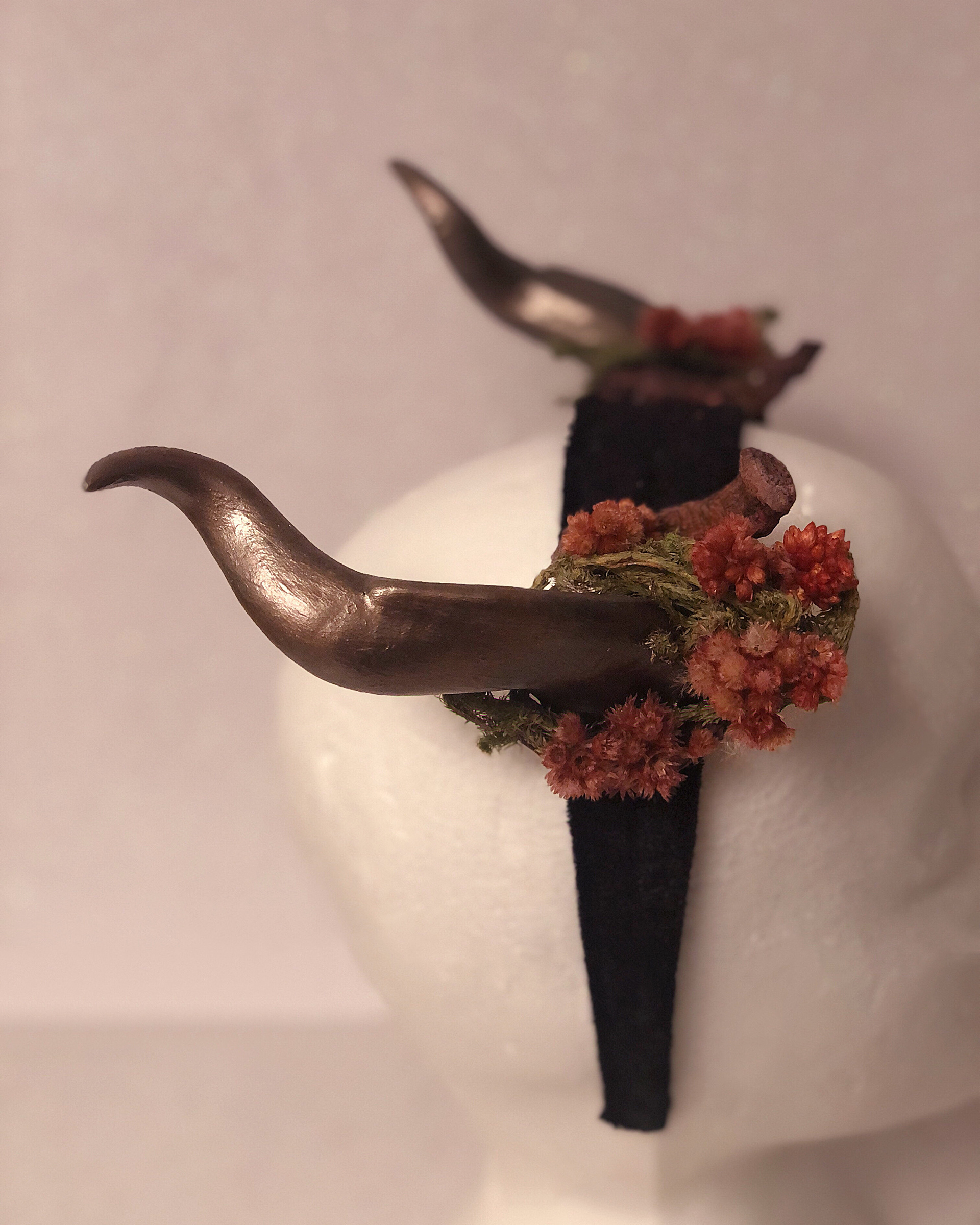 Handmade costume horns. Polyresin, velvet, dried plants (stag’s horn, peony root, beewort root and inked immortelle).