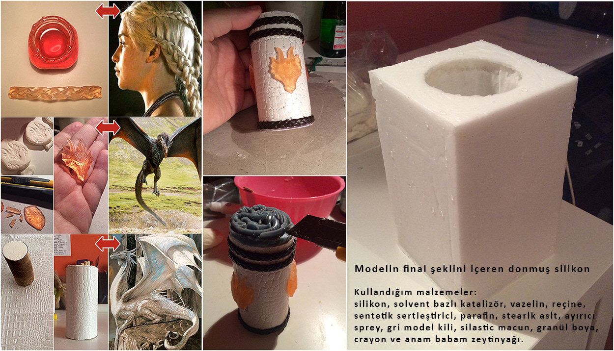 Homemade Game of Thrones 'Targaryen Candle'. (Second image: Modeling phase) Candle details: - Dragon skin texture - Symbol turns into red flow with fire (Targaryen house words: "Fire & Blood") - 3 dragon heads as reference to Targaryen "3 dragons" prophecy. - Embossed Daenerys hair braid