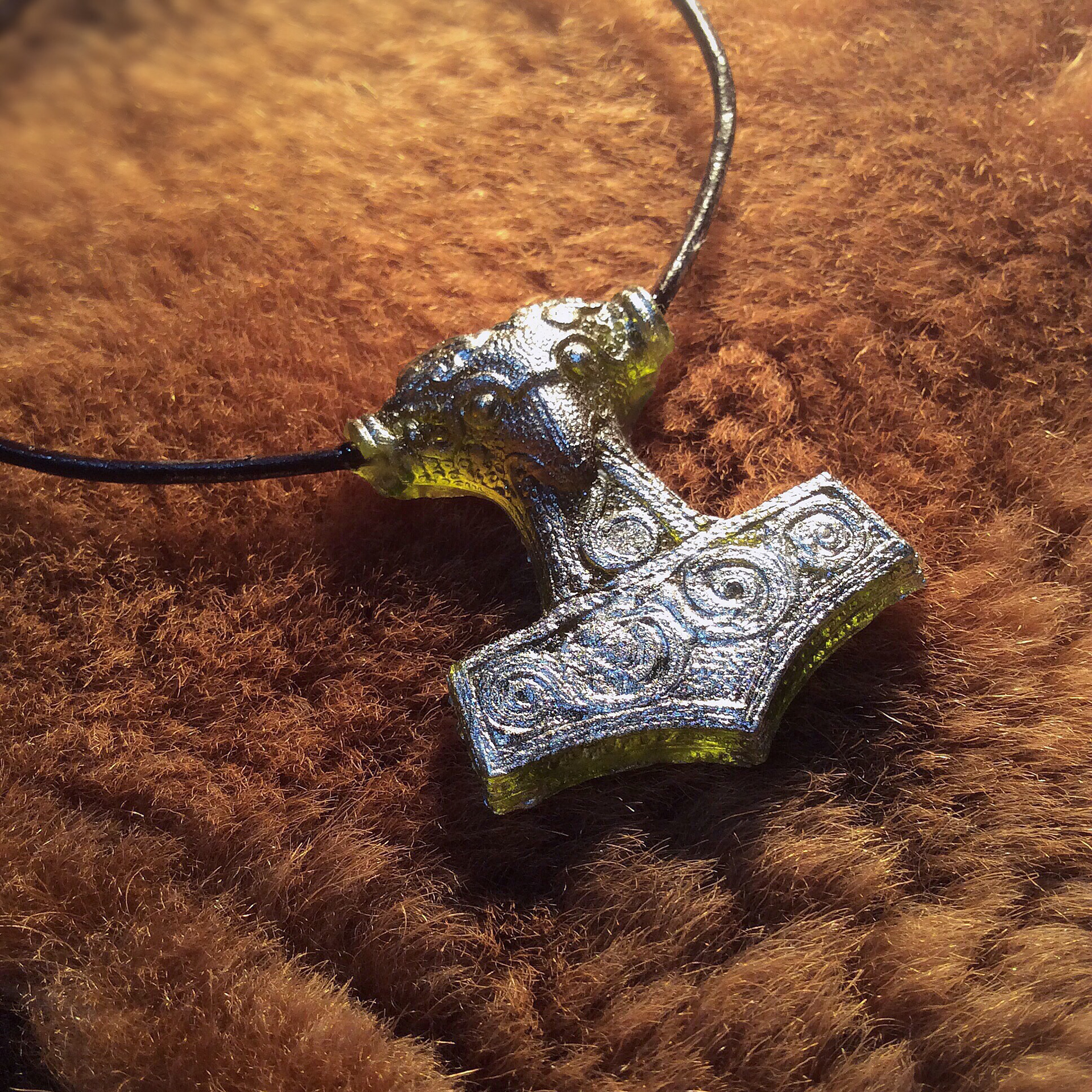Handmade silver/green Mjölnir pendant. In Norse mythology, Mjölnir is the hammer of Thor, a major Norse god associated with thunder. Mjölnir is depicted in Norse mythology as one of the most fearsome weapons, capable of leveling mountains.