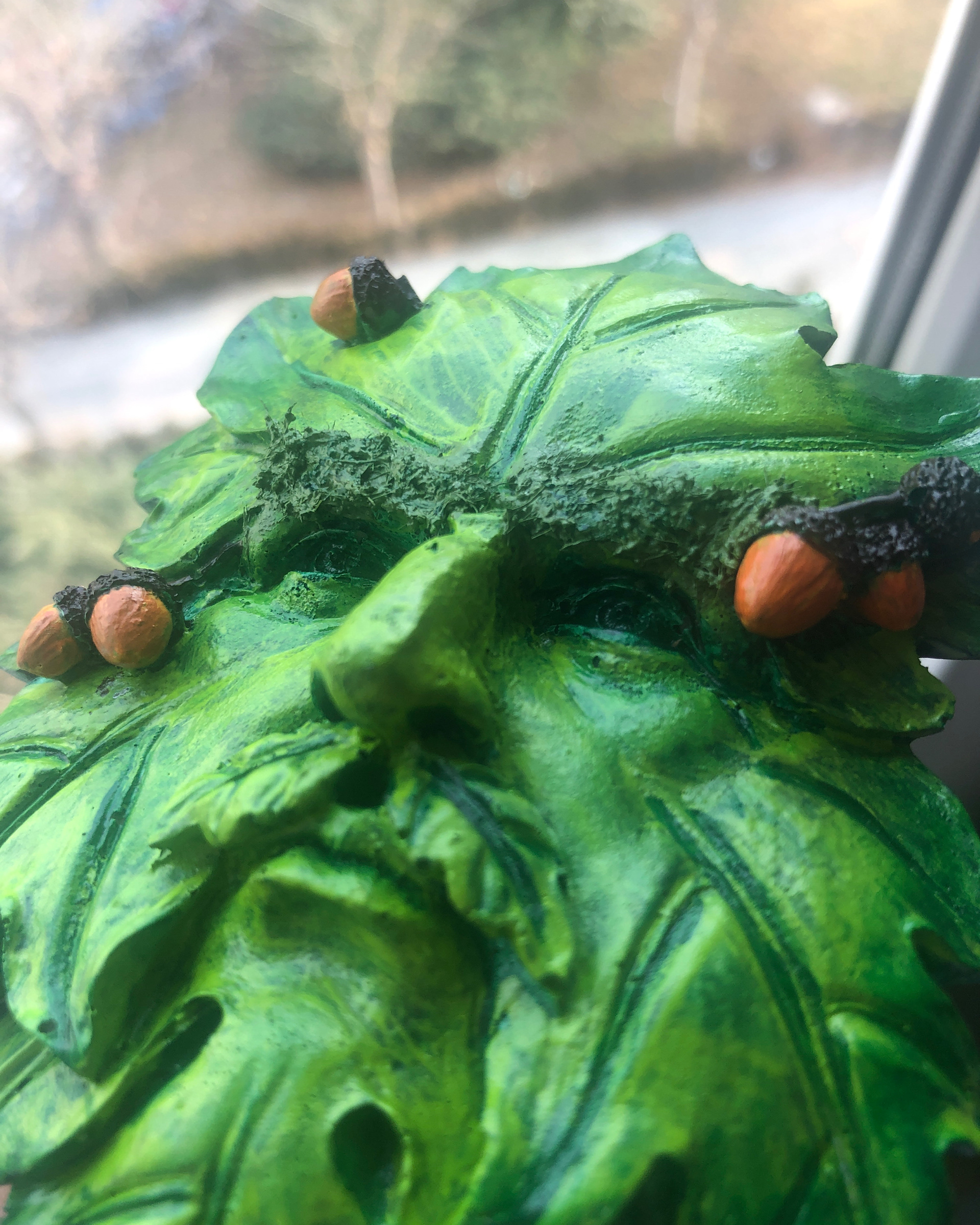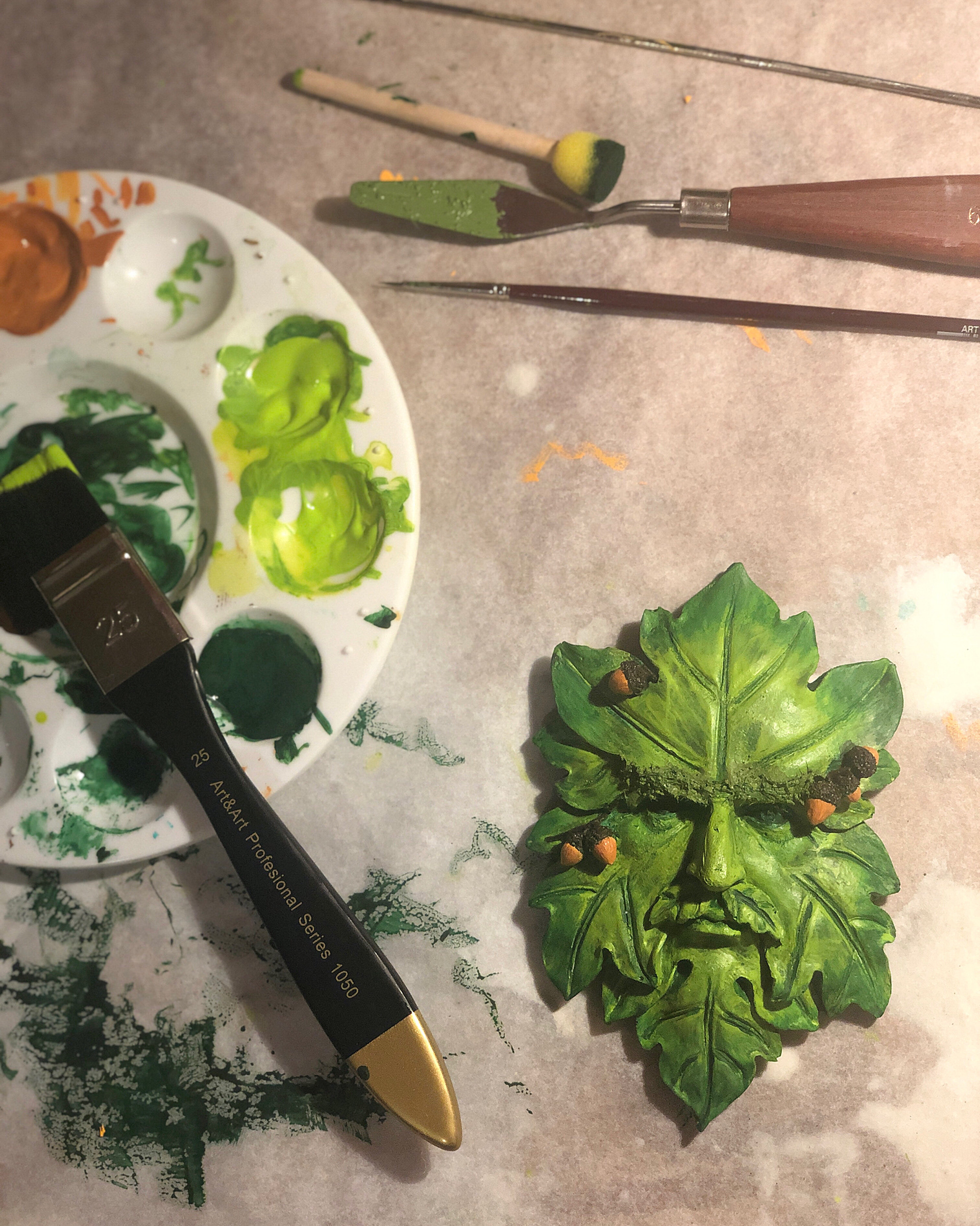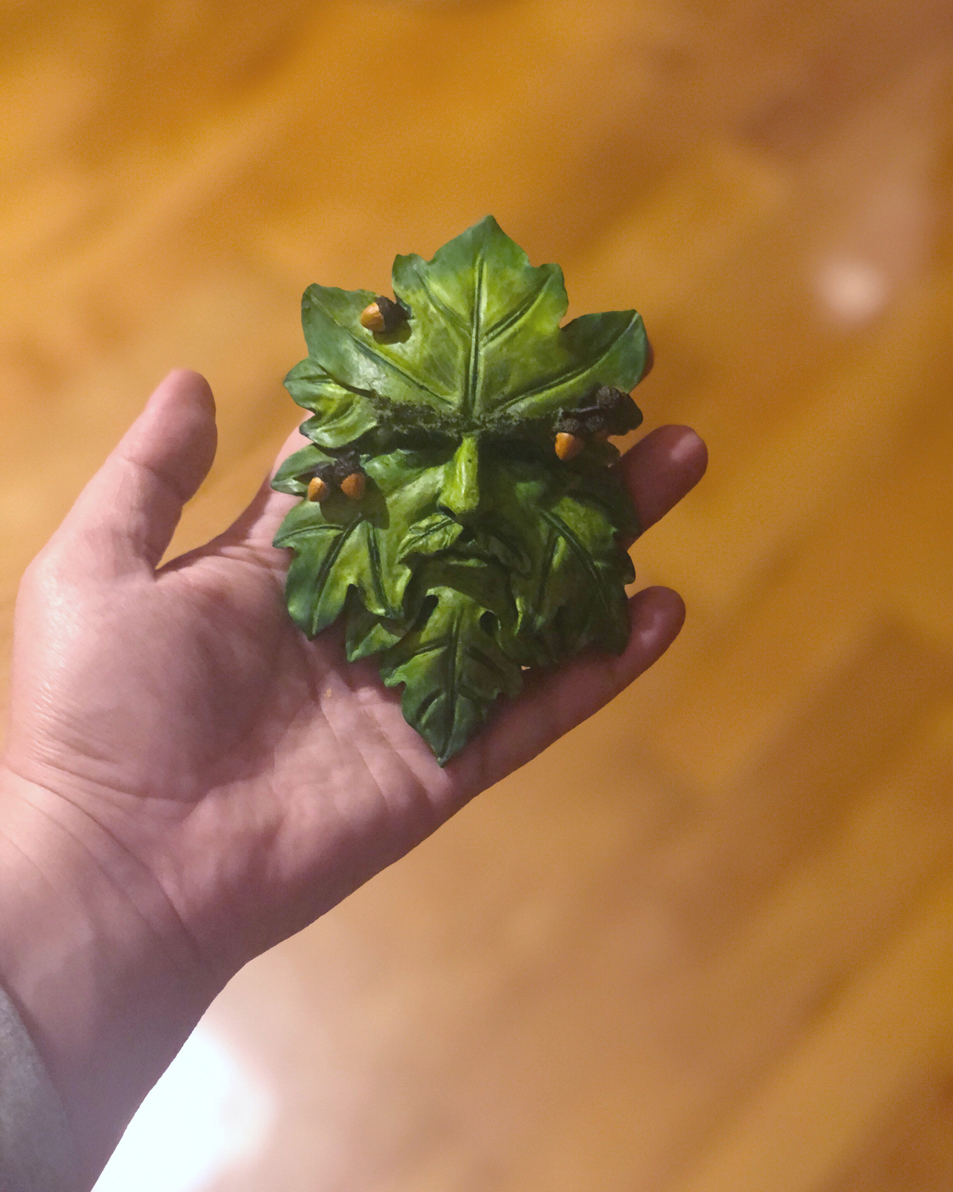 The Green Man is a legendary being primarily interpreted as a symbol of rebirth, representing the cycle of new growth that occurs every spring. Polyresin, acrylic and moss paint.