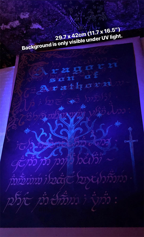 Riddle of Strider poem with Elvish calligraphy. Gold ink on black paper. Background is only visible under UV light. (Lord of the rings)