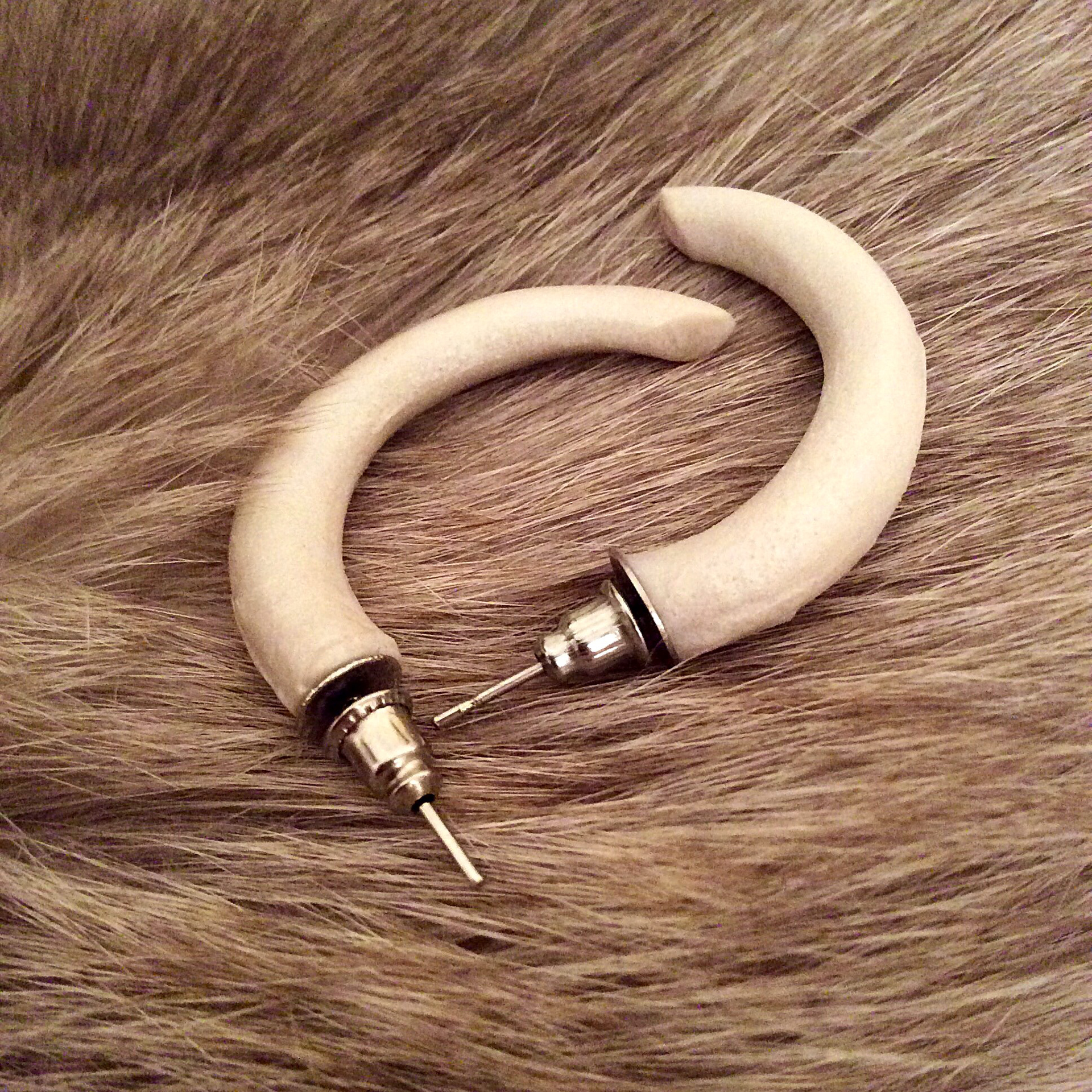 Tusk shaped wilderness earrings handmade from pearl colored resin. Inspired by the movie Captain Fantastic (2016).